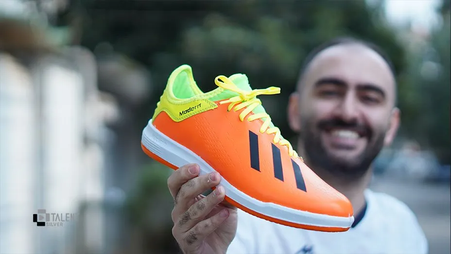 اولین ویژگی که با دیدن این کفش فوتسال شما را به خود جذب میکند، طراحی و رنگبندی آن است. رنگ این کفش نارنجی است و قسمتهای زبانه، بندها و پشت کفش به رنگ سبز فسفری هستند. رویهی کفش از چرم مصنوعی ساخته شده و به همین واسطه میتواند دوام نسبتا خوبی داشته باشد. چسب دور کفش به راحتی باز نمیشود، اما در هر صورت انتظار خیلی بالایی نباید از آن داشته باشید.