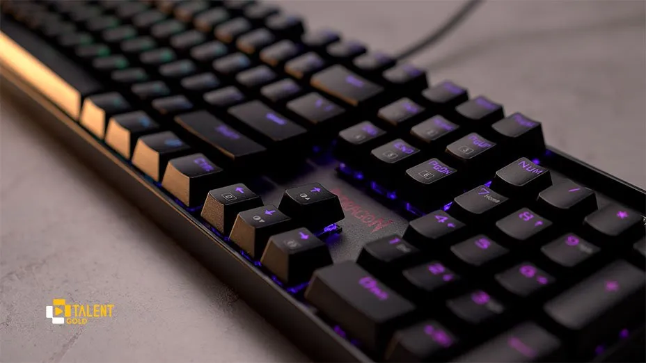این یک کیبورد فولسایز است و بنابراین از تمام کلیدهای یک کیبورد استاندارد بهره میبرد. بنابراین شاهد قرارگیری کلیدهایی مانند F1 تا F12، کلیدهای مربوط به جهت و کلیدهای اعداد در سمت راست کیبورد هستیم. این یک کیبورد مکانیکال است که از سوئیچهای آبی رنگ بهره میبرد. این سوئیچها توسط خود برند ردراگون تولید شدهاند و حین استفاده، صدای بسیار زیادی ایجاد میکنند. بنابراین باید ببینید آیا به استفاده از کیبوردهای پرسروصدا علاقه زیادی دارید یا نه.