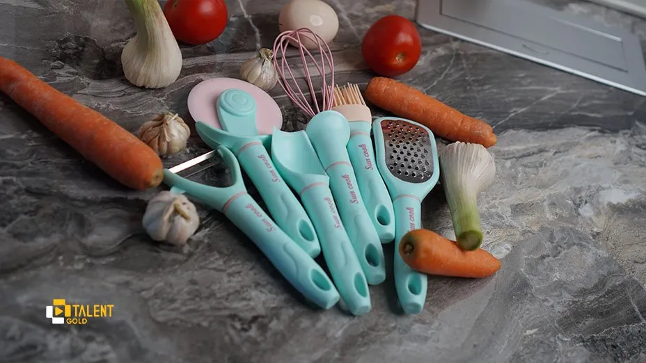این ست ۶ تکه بوده و از یک پیتزابر، فرچه، همزن، اسکوپ بستنی، رنده و پوستکن تشکیل شده است. جنس دستهها از پلاستیک معمولی بوده و کل ست ترکیبی از رنگ سبز و صورتی است. ابزارهای موجود در این ست کم هستند و در واقع فقط ابزارهای مهم و ضروری داخل این مجموعه قرار دارند. جنس همزن فلزی است و برای استفادهی روزمره در آشپزی مناسب است. پوستکن نیز روان و تیز است و برای پوست کردن انواع میوه و سبزیجات کاربرد دارد.