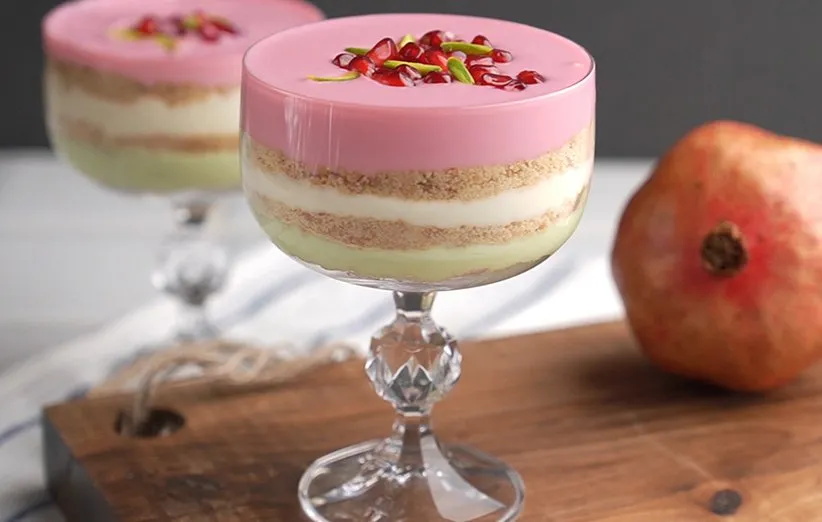 - این دسر چند رنگ و چند لایه را میتوانید با کمی دانهی انار و پسته تزیین کنید.