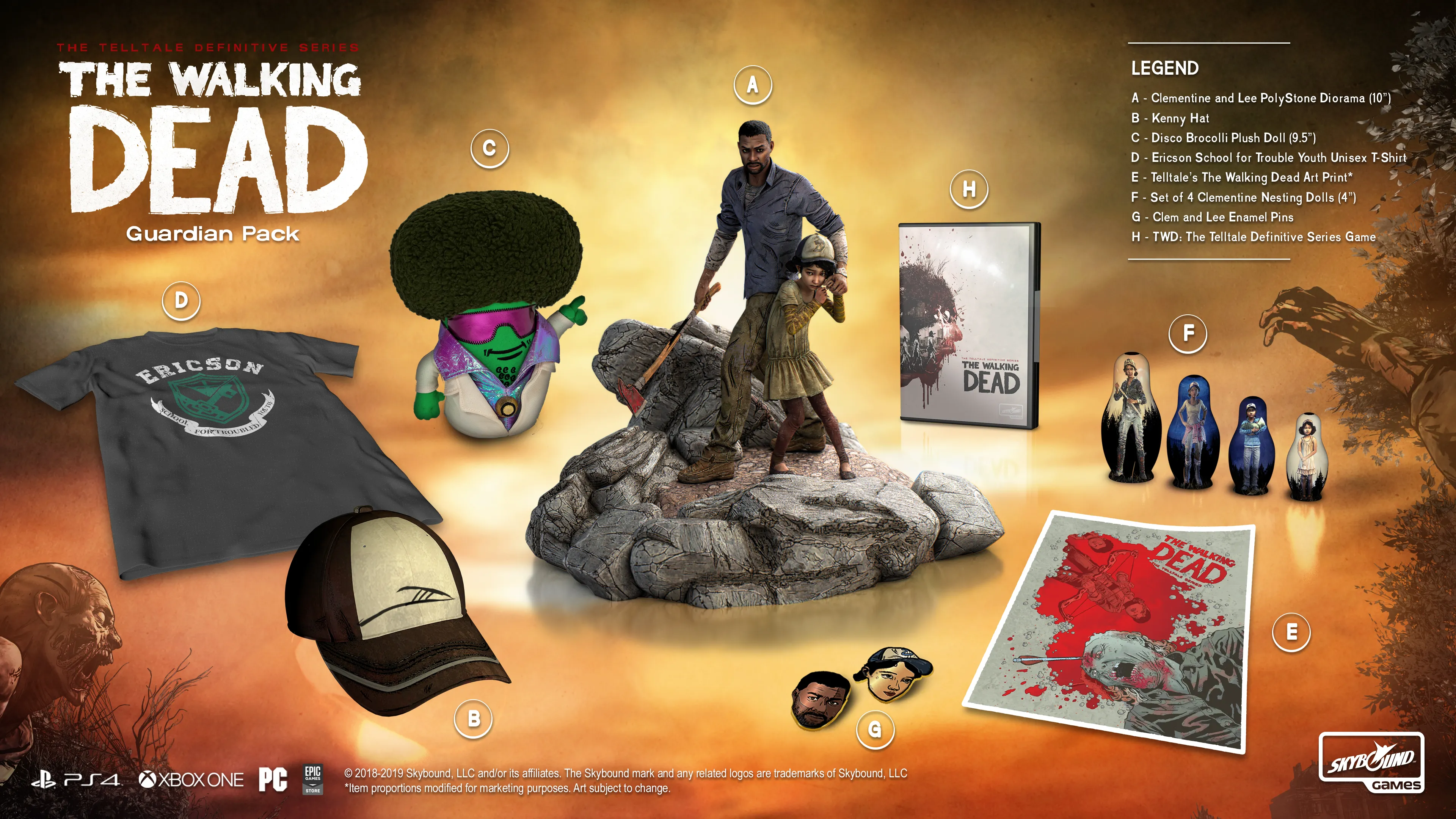 - نسخهی Guardian Pack با قیمت ۲۵۰ دلار: بسته بندی در جعبهی بزرگ امضا شده توسط سازندگان بازی، به همراه تمام محتویات پک بالا به اضافهی یک مجسمه از کلمنتاین و لی.
