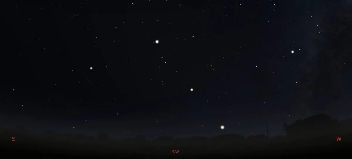 اما از هنگامهی غروب تا چند ساعت آینده فرصت تماشای رویداد درخشانی را دارید که به نوعی در سراسر آذر هم میهمان آسمان شب بود. سه سیارهی تماشایی ناهید، زحل و مشتری به ترتیب در یک راستا قرار گرفتهاند و پس از غروب در افق جنوب غربی بهخوبی قابل دیدن هستند.