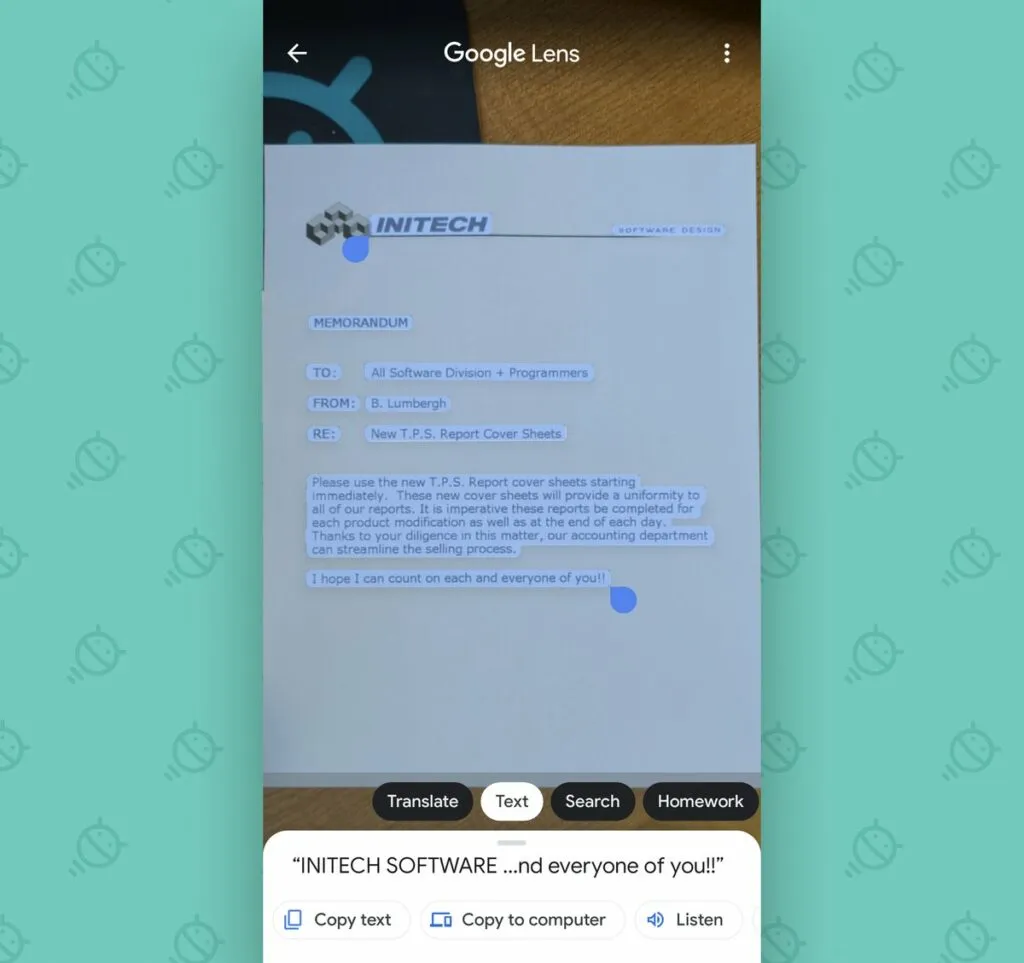 یکی از جالبترین ویژگیهای گوگل لنز، توانایی انتخاب متنهای روی یک کتاب، جزوه، تبلیغ، وایت برد، محصول، تلویزیون و یا هر نوع متنی در دنیای واقعی و کپی کردن آن است. سپس از این متن میتوانید در هرکجا که میخواهید استفاده کنید.