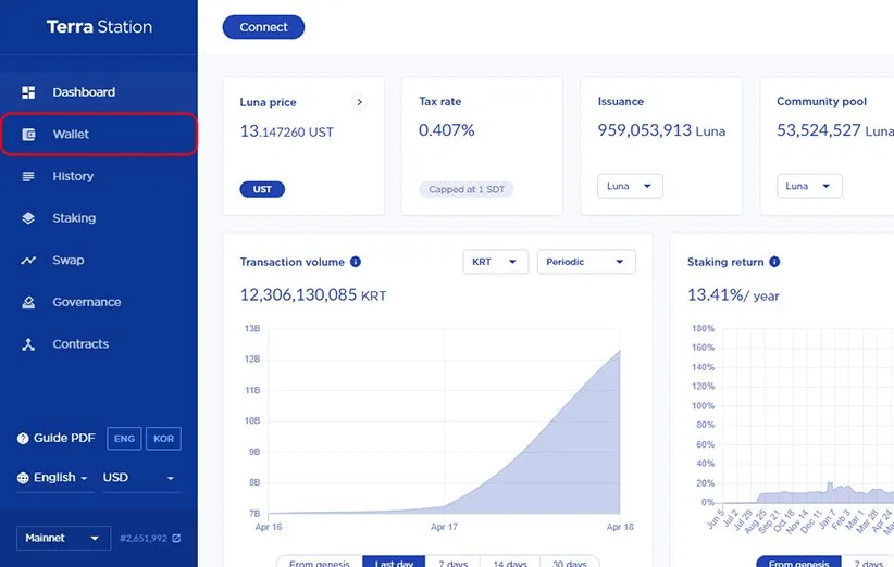 1. داشبورد Terra Station طیف وسیعی از داده های زنجیرهای، از جمله حجم تراکنش، بازده سهام و تعداد حسابهای فعال را نمایش میدهد.