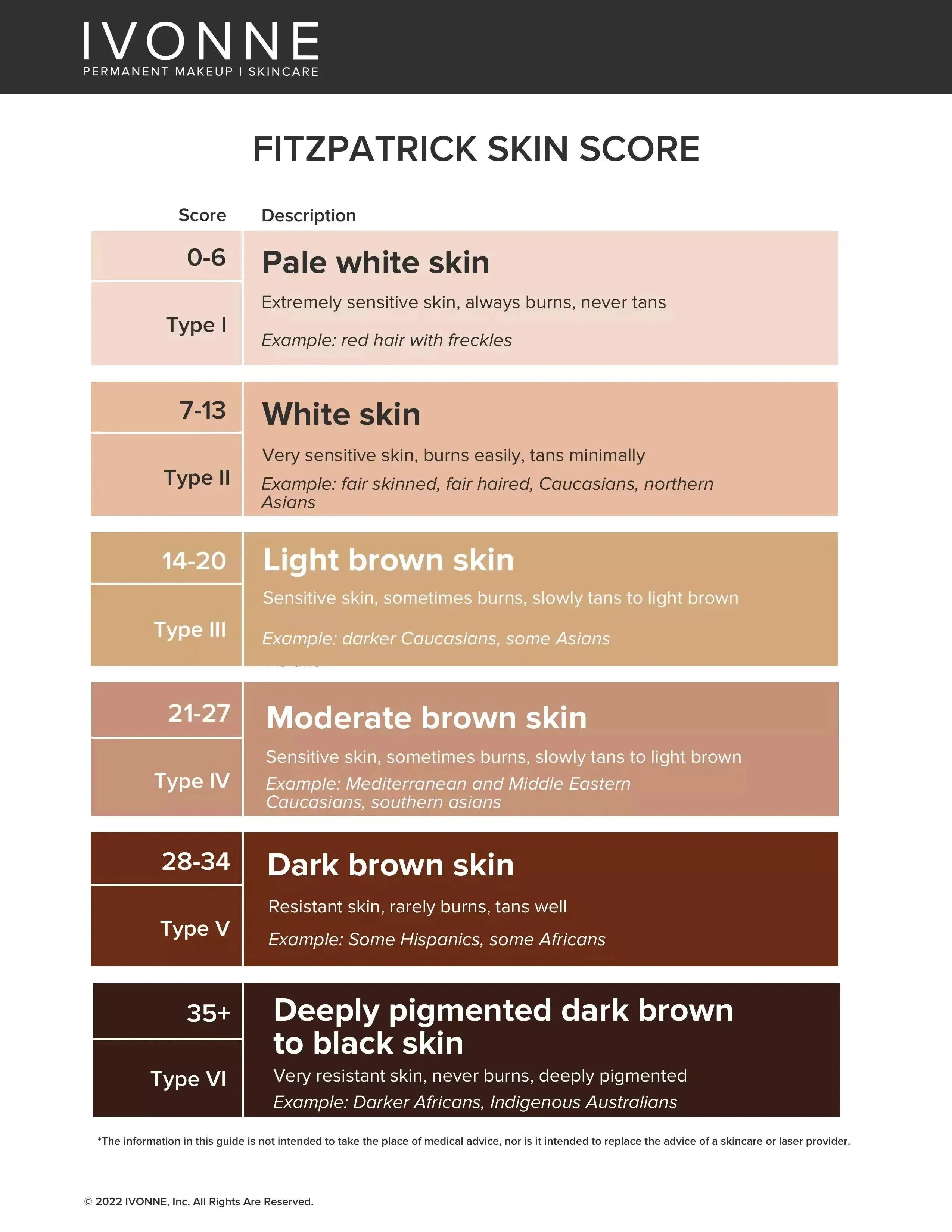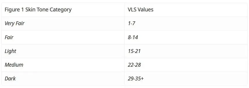 این جدول یک معیار مهم را در تحقیقات ما معرفی میکند و آن هم طبقهبندی نوع پوست براساس استانداردهای فیتزپاتریک (FSP) است. با این حال یک مشکل بزرگ بلافاصله آشکار میشود. ما 6 نوع پوست داریم که بر اساس مقیاس فیتزپاتریک طبقهبندی شدهاند، اما تنها ۵ نوع پوست در مقیاسضد آفتاب BB وجود دارد و بدین ترتیب مقیاس رنگی فون لوشان (VLS) را معرفی میکنیم. البته باید به اعداد در سمت چپ مقیاس FSP توجه کنید. این اعداد مربوط به مقیاس قدیمیتر اما هنوز قابل اعتماد، VLS هستند. این اعداد به ما امکان میدهند 35 طبقهبندی VLS را که مقیاس FSP را تشکیل میدهند، داشته باشیم و آنها را به 5 دستهی مساوی تقسیم کنیم که به طور مستقیم با رنگ پوست در جدول BB مطابقت دارد. حال اجازه دهید، مقیاس 5 طبقهای جدید خود را از نظر مقادیر VLS بدست آوریم.
