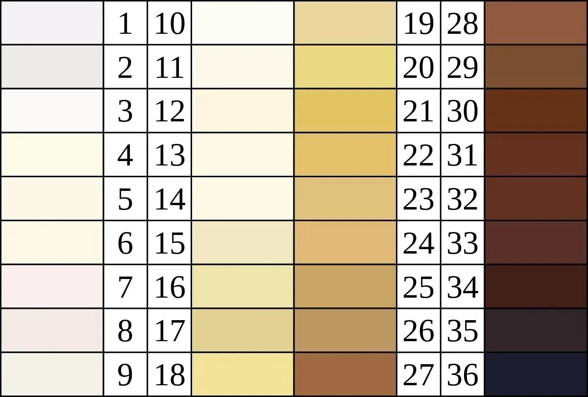 این جدول به جای 0 از 1 شروع میشود زیرا مقیاس اصلی VLS بین 1 تا 36 است. از طرفی ما 36 را در ردهی تیره (Dark) به حساب میآوریم، زیرا هر چیزی بالاتر از 35 همچنان در رنگ پوست نوع VI در مقیاس FSP قرار میگیرد. اکنون، همه چیز آماده است تا نوع پوست NPC موجود در تریلر را تعیین کنیم. در ادامه بیایید نگاهی به رنگهای جداگانه برای مقادیر مختلف VLS بیندازیم و مقدار VLS مربوط به رنگ پوست NPC را به صورت تقریبی بدست آوریم.