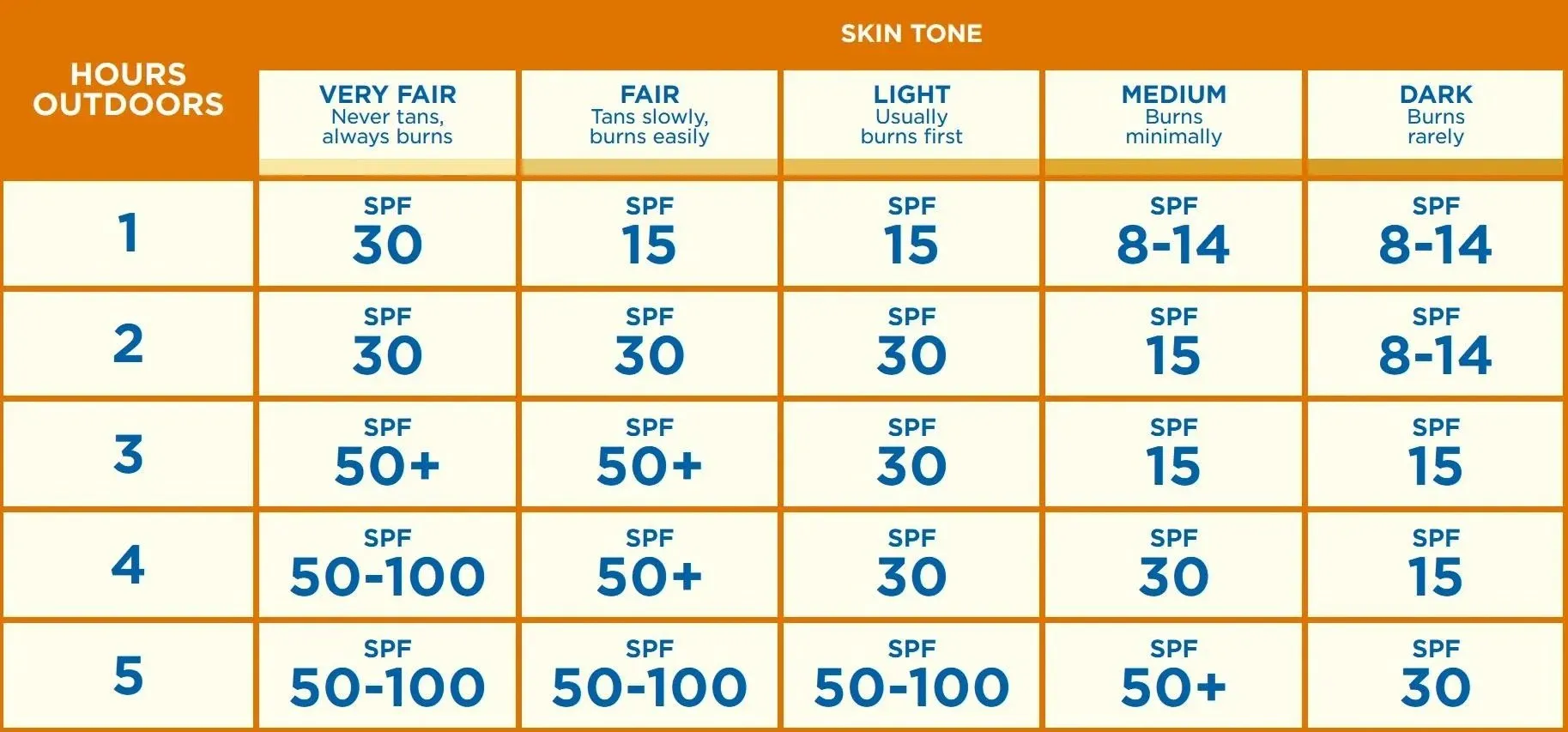 اولین مرجع ما جدولی است که از برند معتبر ضدآفتاب Banana Boat است. این جدول روشی سریع را برای تعیین اینکه کدام کرم ضد آفتاب با SPF در شرایط بهینه روی فرد اعمال میشود را ارائه میدهد و شامل پارامترهایی نظیر رنگ پوست و ساعتهای گذرانده در فضای باز میشود.