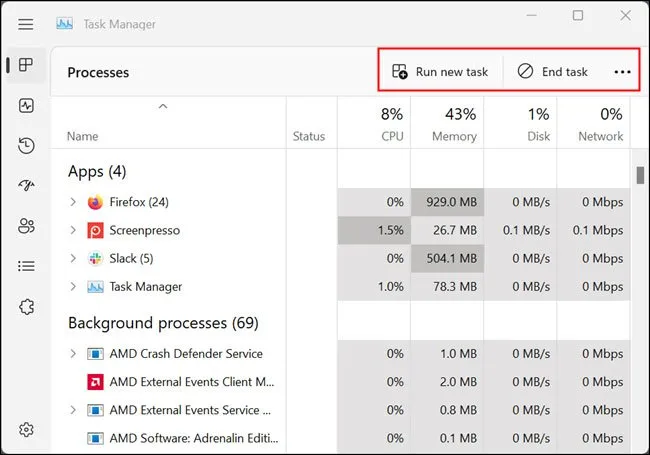 همچنین گزینههایی مانند End Task و Run New Task در سمت راست بخش فوقانی رابط کاربری دیده میشوند.
