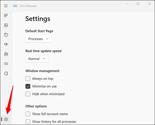 گزینههای مختلف مربوط به تنظیمات Task Manager حالا راهی یک صفحه شدهاند تا کاربران راحتتر از گذشته بتوانند به آنها دسترسی داشته باشند. برای راهیابی به این صفحه باید روی آیکن چرخدنده در سمت چپ بخش پایینی رابط کاربری کلیک کنید.