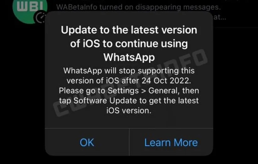 در همین راستا افشاگر معروف اطلاعات و قابلیتهای واتساپ یعنی «WABetaInfo» اسکرینشاتی را منتشر کرده که نشان میدهد از تاریخ 24 اکتبر 2022 (2 آبان ماه) پیامرسان روی سیستمعاملهای iOS 10 و iOS 11 کار نخواهد کرد. همچنین بخش پشتیبانی واتساپ نیز اعلام کرد که تنها کاربران نسخههای iOS 12 و بالاتر میتوانند از قابلیتهای این پیامرسان بهره ببرند. بنابراین اگر از کاربران سیستمعامل iOS 10 در گوشیهای آیفون 5، آیفون 5S و آیفون 6 هستید، برای استفاده از این اپلیکیشن باید سیستمعامل گوشی خود را بهروزرسانی کنید.