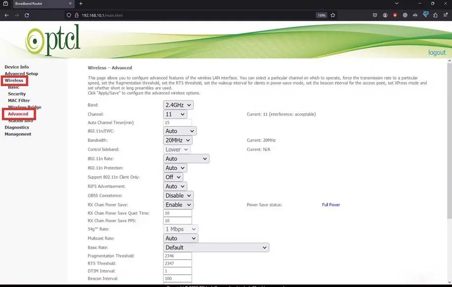 در گام بعدی تغییر فرکانس مودم از 2.4 به 5 باید دنبال بخش Wireless یا دیگر نامهای مشابه بگردید که میتوانید در این قسمت تنظیمات مربوط به شبکه وایفای را تغییر دهید.