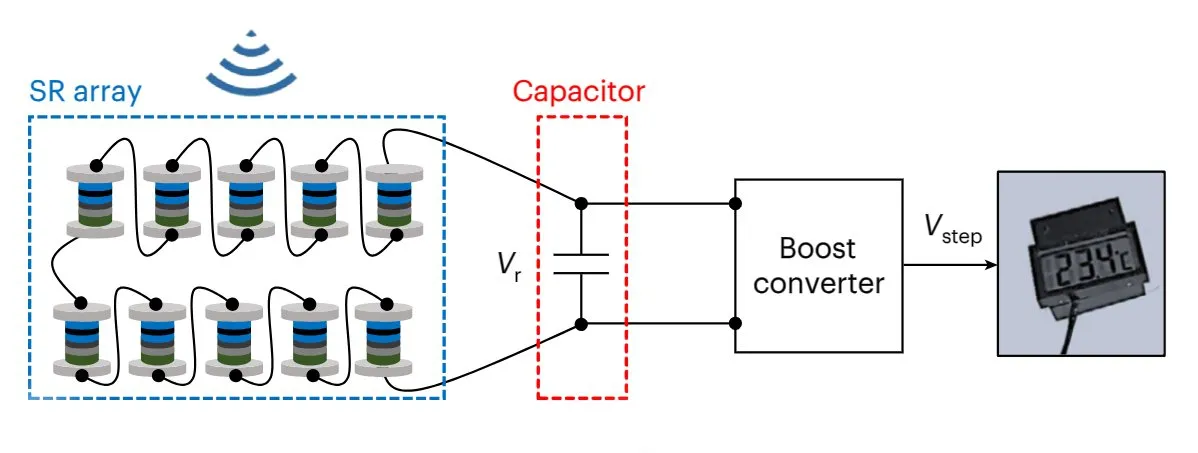 پس از نشان دادن اثربخشی این روش به تنهایی، پژوهشگران با ایجاد یک آرایهی SR، برق یک دماسنج تجاری را تنها با استفاده از 27- دسیبل میلیوات سیگنال RF محیطی تأمین و آن را روشن کردند. این تیم امیدوار است که در آینده این روش بتواند هزینهی کربن راهاندازی شبکههای بیسیم را با کاهش وابستگی به باتری و مصرف انرژی در حسگرها و دیگر دستگاههای کوچک کاهش دهد.