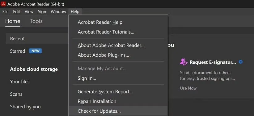 برای بهروز رسانی برنامه ابتدا نرم افزار ادوبی آکروبات ریدر را باز کرده و سپس به مسیر Help > Check for Updates بروید. برنامه به طور خودکار بستههای بهروز رسانی جدید را بررسی و در نهایت شما میتوانید برنامه را به آخرین نسخه بهروز رسانی کنید.