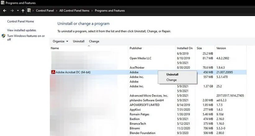 قبل از نصب مجدد برنامه، ابتدا برنامه را آنیستال کرده و سپس فایلهای سیستمی مرتبط با این برنامه را هم از هارد پاک کنید. برای انجام این کار ابتدا به مسیر Control Panel > Programs and Features بروید. به محض پیدا کردن Adobe Acrobat DC، روی آن راست کلیک و سپس Uninstall را انتخاب کنید.