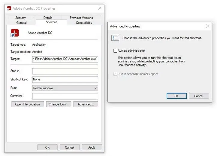 وقتی شما به یک برنامه دسترسی ادمین میدهید، در واقع برنامهی مورد نظر میتواند به تمام فایلهای روی سیستم عامل که حتی محدود شدهاند هم دسترسی داشته باشد. از همین رو، دومین راه حلی که باید بررسی کنید، اجرای اکروبات ریدر به صورت Administrator است. اگر ویندوز جلوی برنامهی ادوبی را میگیرد تا فایل PDF را به دلیل دسترسیهای گمشده یا خراب شده باز نکند، اجرای برنامه با دسترسی ادمین این ایراد را برطرف میکند.