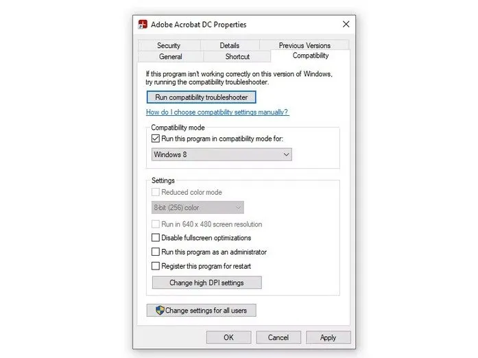 اگر شما صاحب نسخهای از برنامهی آکروبات ریدر هستید که با نسخهی کنونی سیستم عامل ویندوز سازگار نیست، پس بهتر است برنامه را در حالت Compatibility Mode اجرا کنید. برای انجام این کار اقدامات زیر را انجام دهید: