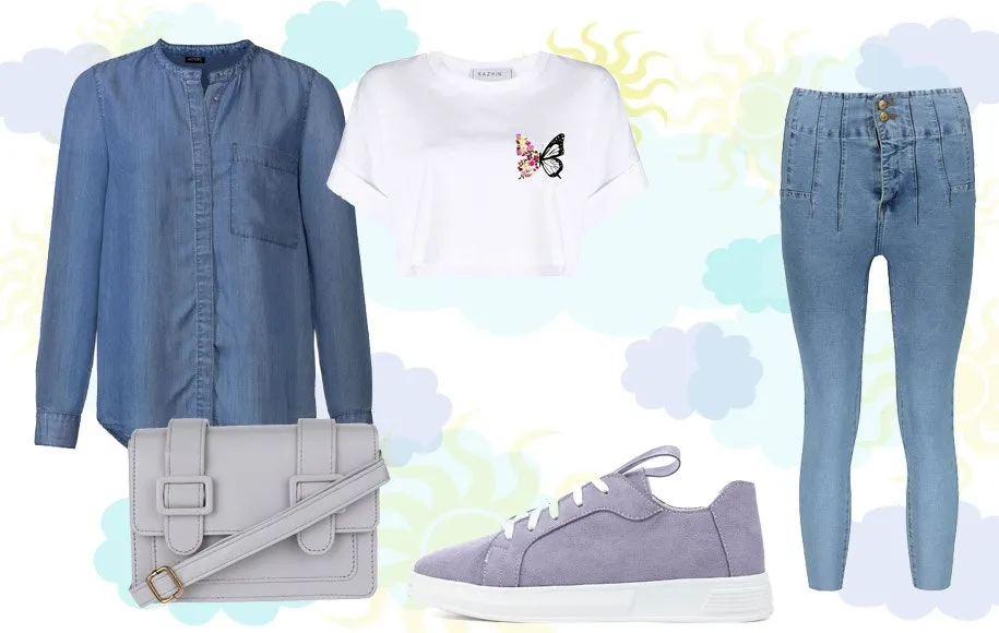 در استایل کژوال تابستانه (شومیز با شلوار لی جذب) ترکیب شومیزهای خنک با جین راسته یکی از کلاسیکترین ترکیبهاست. در زیر شومیزتان میتوانید یک نیمتنه یا تاپ هم ست کنید و دکمههای شومیزتان را باز بگذارید. در این ست خنک تابستانه یک شومیز باجنس پارچه لایوسل از برند اسمارا انتخاب کردهایم که با یک شلوار جین جذب، یک کفش روزمرهی جیر به رنگ آبی، یک نیمتنهی سفید و یک کیف چرمی به رنگ آبی یخی ست میشود.