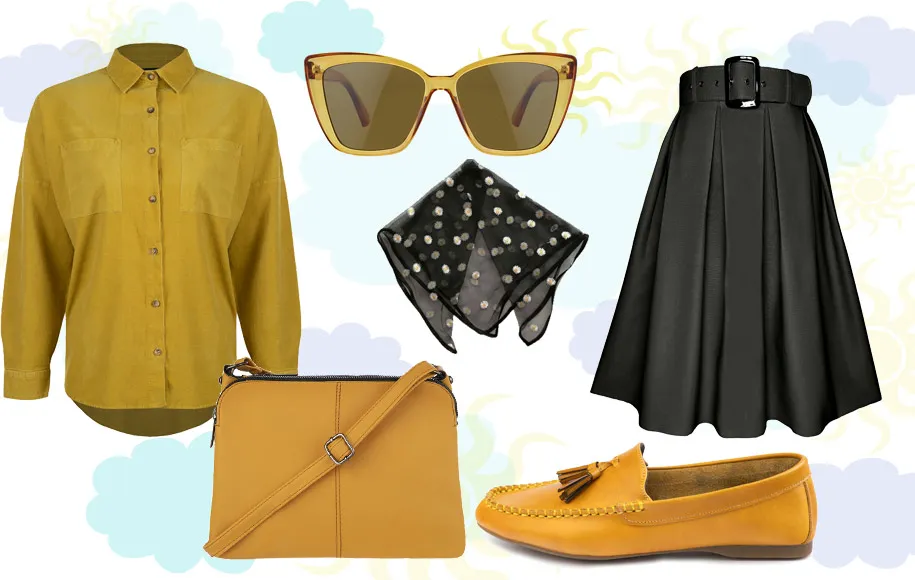 برای جذابتر شدن این استایل میتوانید یک مینیاسکارف جذاب توری با طرح گلهای بابونه و یک عینک آفتابی خاص با قاب خردلی به این ست اضافه کنید. همراه با دامن میدی میتوانید یک جوراب شلواری رنگ پا و یا مشکی انتخاب کنید و بپوشید.