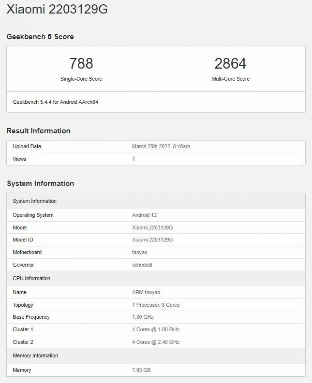 امتیازی که شیائومی 12 لایت در گیکبنچ کسب کرد در بخش تک هستهای و چند هستهای به ترتیب 788 و 2864 است که تقریبا هم سطح با امتیاز کسب شده توسط تمام گوشیهایی است که از این تراشه به عنوان قلب تپنده استفاده میکنند. از جمله اطلاعاتی که به لطف این لیست توانستیم کسب کنیم، وجود اندروید 12 و رابط کاربری MIUI 13 است که به صورت پیشفرض روی این گوشی نصب شدهاند.