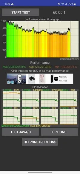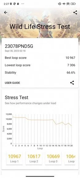 گلکسی S23 FE عملکرد پرنوسانی در بخش پردازشی داشت و با 66٪ توان پردازندهاش تست را به پایان رساند اما گرافیک آن 54٪ از توانش را در 20 دقیقه از دست داد. همچنین قدرت گرافیک شیائومی فقط در اواخر تست کم شد اما نمایندهی سامسونگ در همان چند دقیقهی ابتدایی ناامیدکننده ظاهر شد.