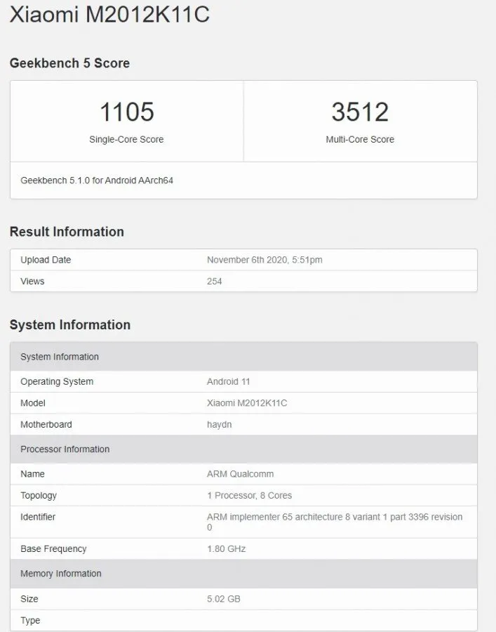 این گوشی جدید که گفته میشود شیائومی می 11 نام خواهد داشت، با شماره مدل M2012K11C، اندروید 11، 6 گیگابایت حافظهی رم و پردازندهی اسنپدراگون 875 در گیکبنچ حضور یافته. البته در گیکبنچ معمولا نامی از پردازنده برده نمیشود اما از آنجایی که به نام گرافیک آدرنو 660 در سورس کد این لیست اشاره شده، میتوانیم تا حدودی از این بابت که گوشی یاد شده به پرچمدار کوالکام مجهز خواهد شد مطمئن باشیم.