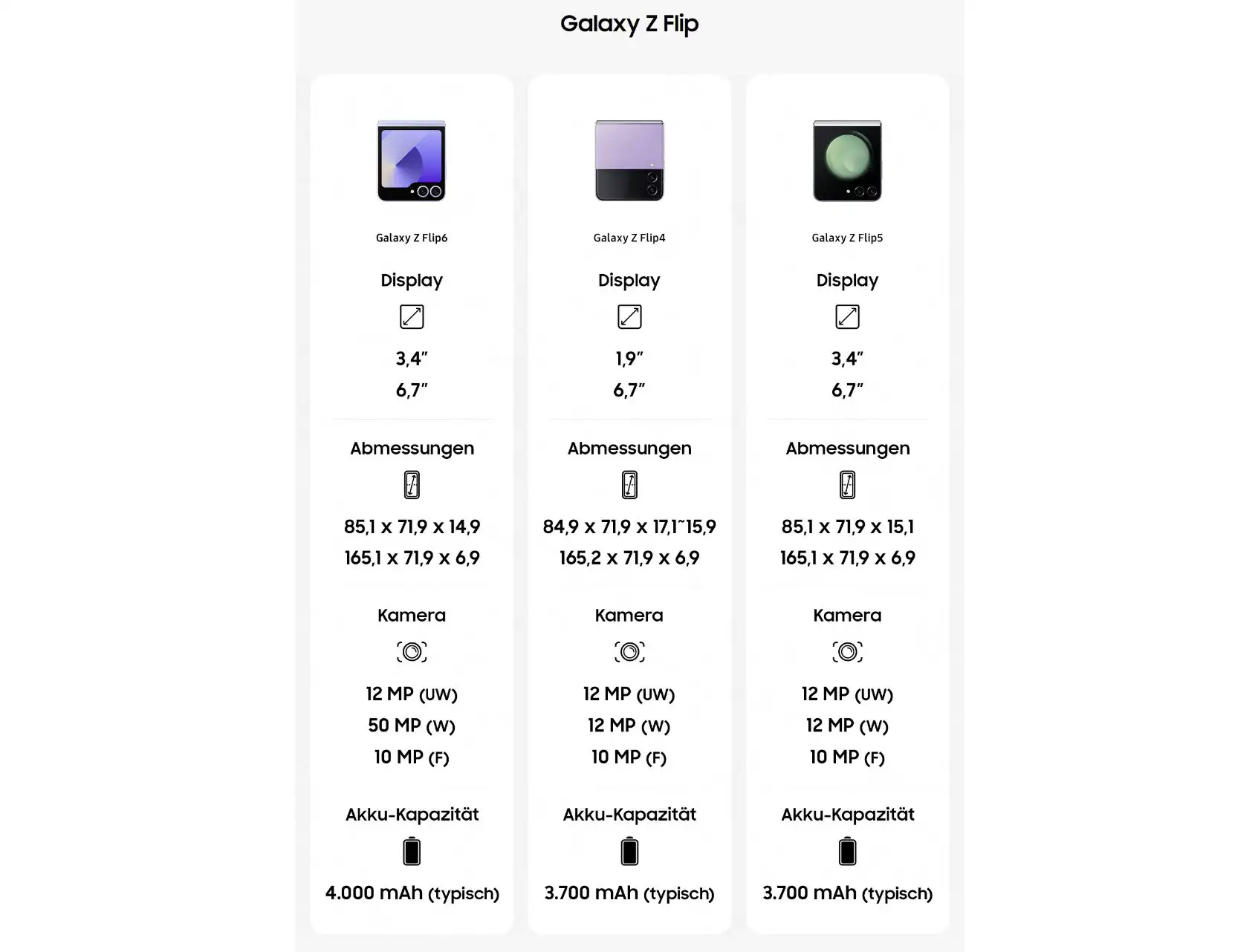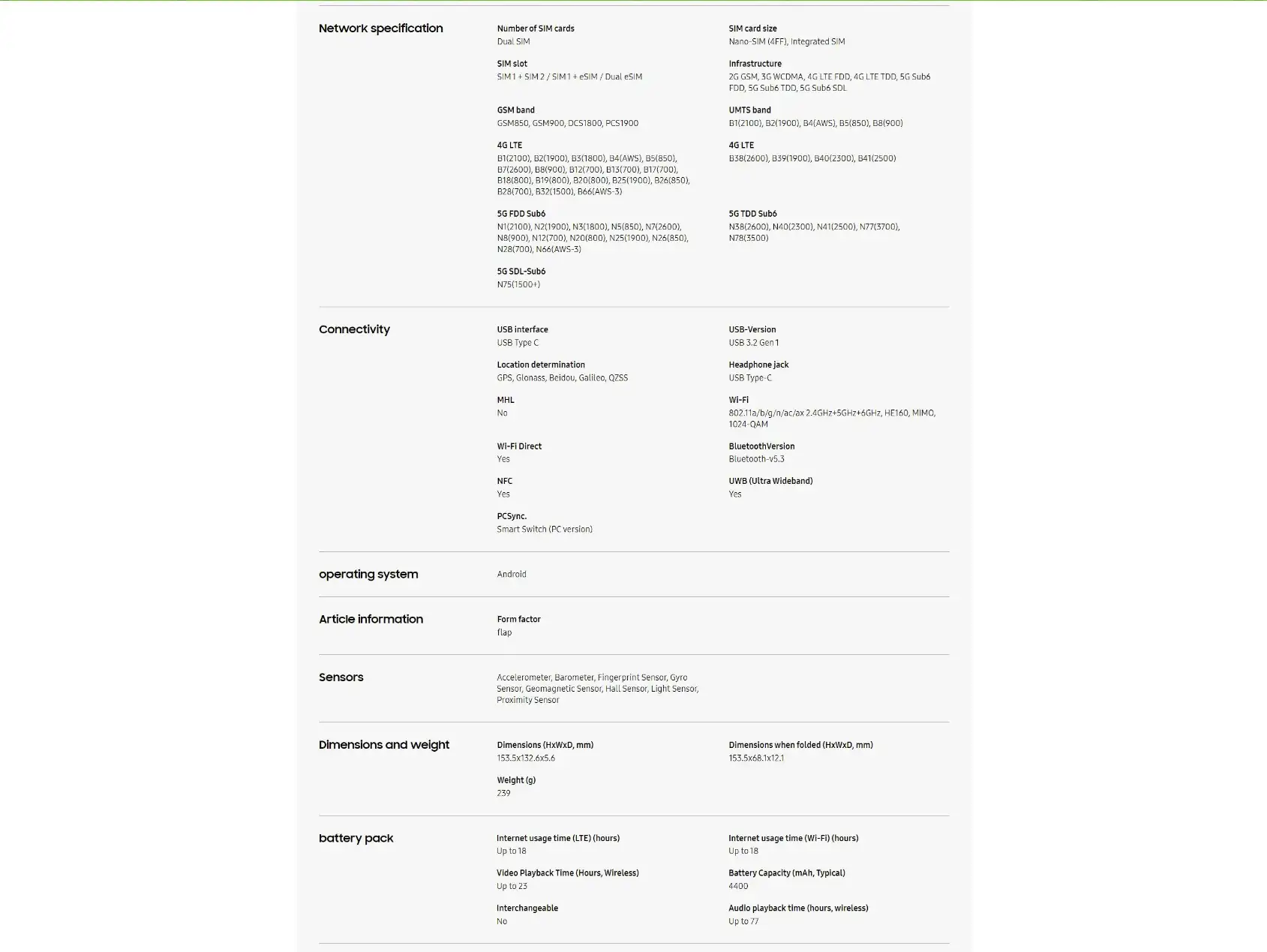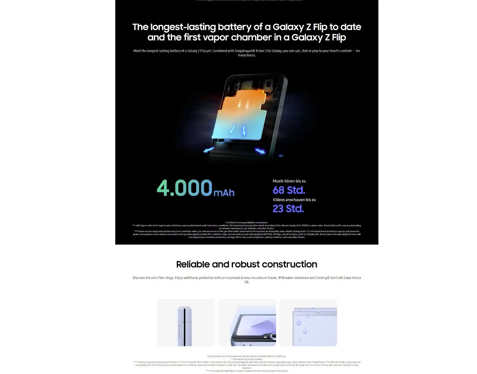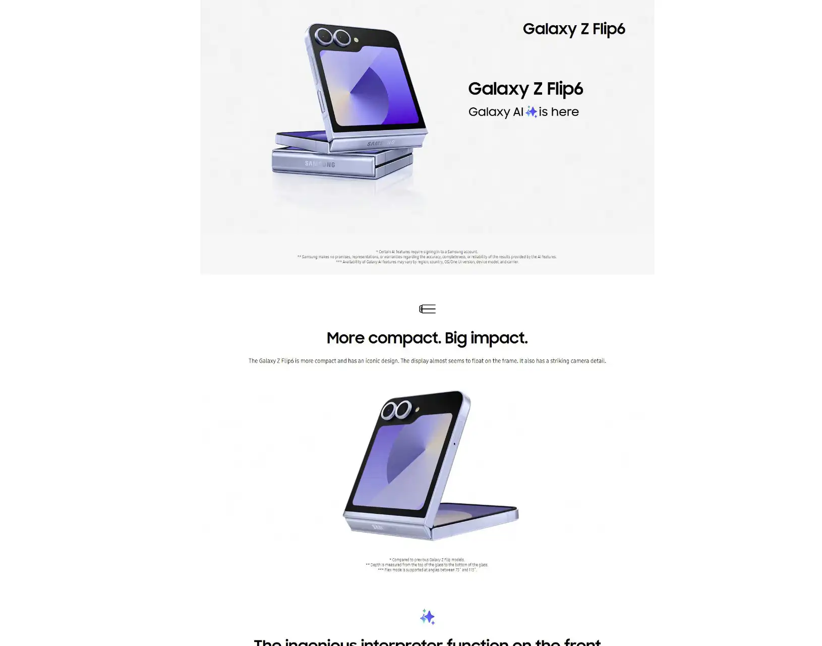 از طرف دیگر، به نظر میرسد گلکسی زد فلیپ ۶ بهروزرسانیهای اساسیتری دریافت میکند. تصاویر تبلیغاتی فاششده، باتری ۴۰۰۰ میلی آمپر ساعتی را تأیید میکند که بزرگترین باتری در یک گوشی گلکسی زد فلیپ تا به امروز است و به نگرانیهای مربوط به عمر باتری در مدلهای قبلی رسیدگی میکند. همچنین ذکر شده است که این گوشی همانطور که قبلا شایعه شده بود، یک دوربین اصلی ۵۰ مگاپیکسلی جدید دارد.