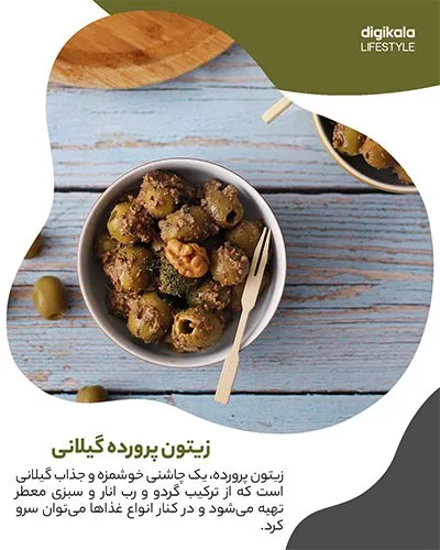 زیتون پرورده یک چاشنی خوشمزه و جذاب گیلانی است که از ترکیب گردو و رب انار و سبزی معطر تهیه میشود و در کنار انواع غذاها میتوان سرو کرد.