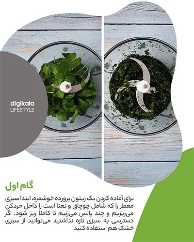 برای آماده کردن یک زیتون پرورده خوشمزه، ابتدا سبزی معطر را که شامل چوچاق و نعناع است را داخل خردکن میریزیم و چند پالس میزنیم تا کاملا ریز شود. اگر دسترسی به سبزی تازه نداشتید میتوانید از سبزی خشک هم استفاده کنید.