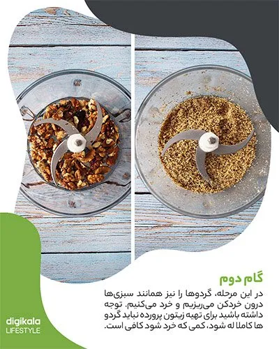 در این مرحله، گردوها را نیز همانند سبزیها درون خردکن میریزیم و خرد میکنیم. توجه داشته باشید برای تهیه زیتون پرورده نباید گردوها کاملا له شود؛ کمی که خرد شود کافی است.