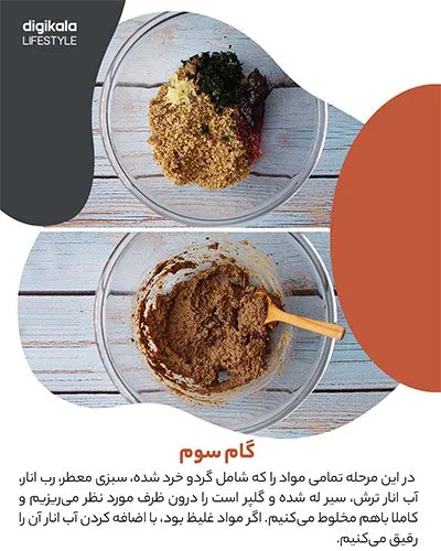 در این مرحله تمامی مواد را که شامل گردوی خرد شده، سبزی معطر، رب انار، آب انار ترش، سیر له شده و گلپر است را درون ظرف مورد نظر میریزیم و کاملا باهم مخلوط میکنیم. اگر مواد غلیظ بود با اضافه کردن آب انار آن را رقیق میکنیم.