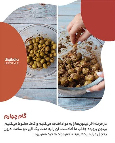 در مرحلهی آخر، زیتونها را به مواد اضافه میکنیم و کاملا مخلوط میکنیم. زیتون پرورده جذاب ما آماده است. آن را به مدت یک الی دو ساعت درون یخچال قرار میدهیم تا طعم مواد به خرد هم برود.